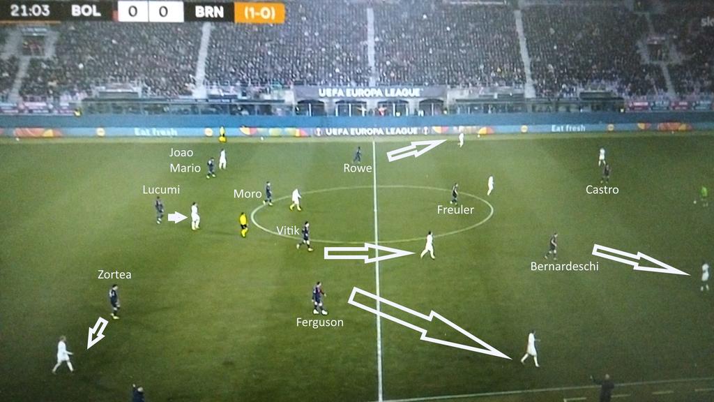 In fase di costruzione, Bernardeschi (ma anche Orsolini), l’ala destra mancina, torna molto indietro per poi lanciare nello spazio offenisvo Zortea. E’ anche bravo col dribbling. Preferisce accentrarsi per andare sul sinistro e tirare, ma può andare anche lungo sul lato per fare l’assist basso. L’ala sinistra, Rowe, va principalmente verso il centro per tirare di destro.
